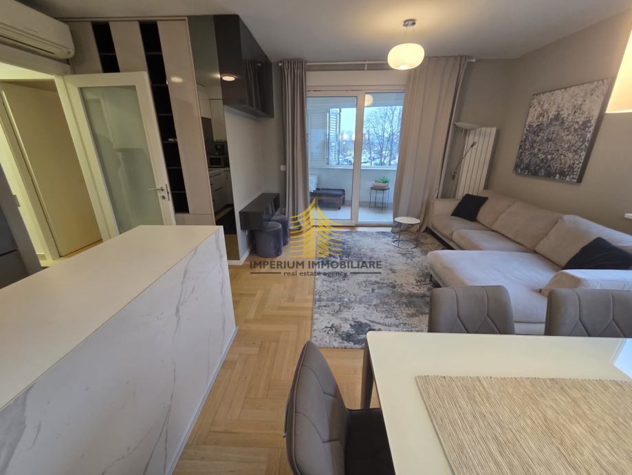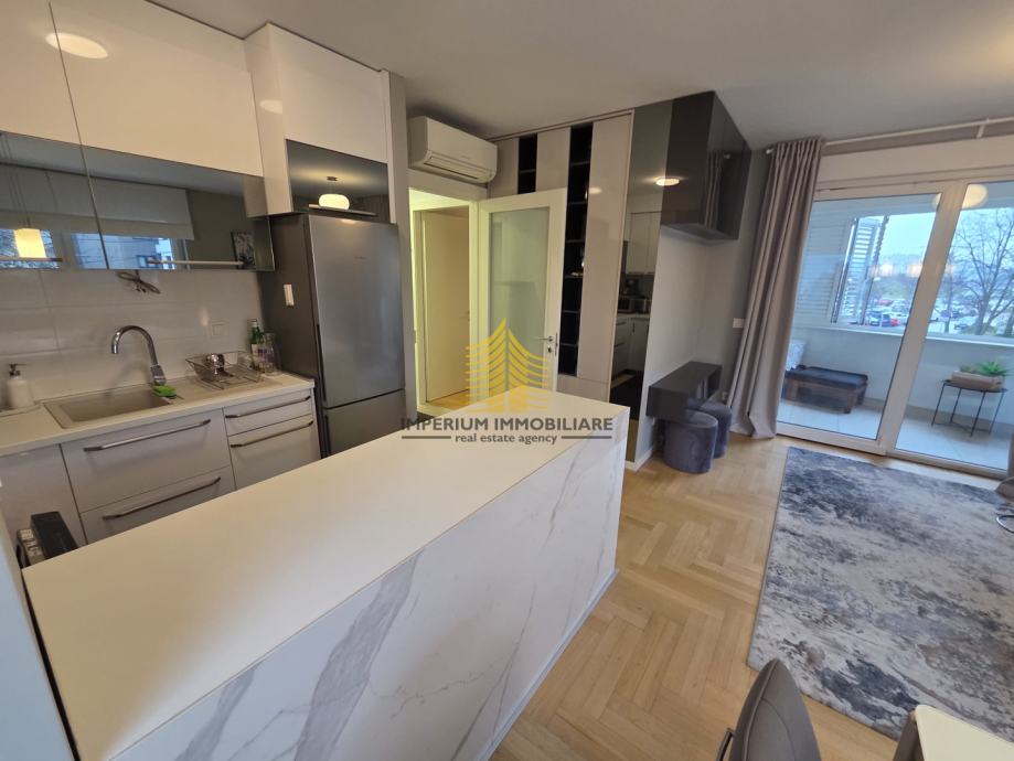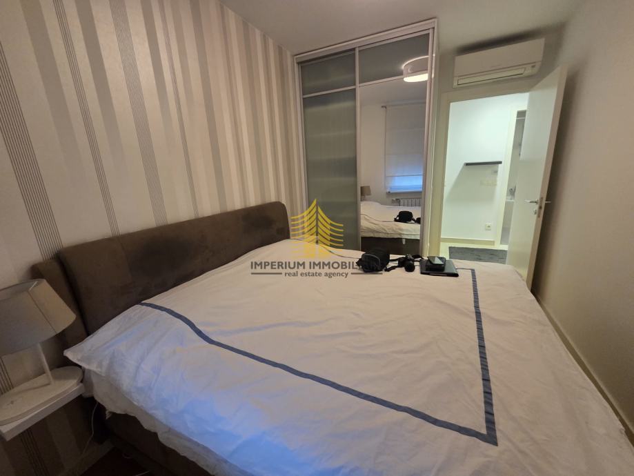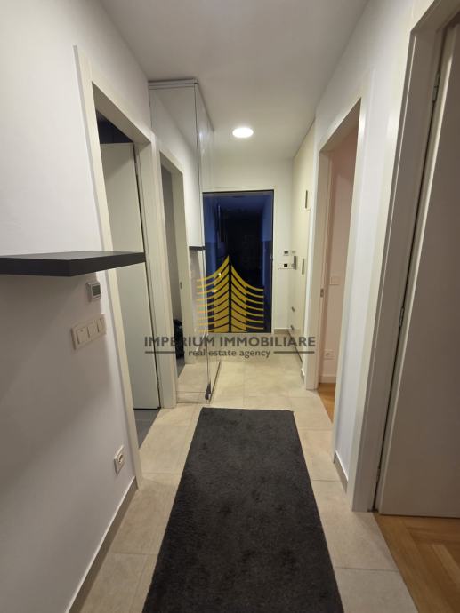 Stan se sastoji od ulaznog hodnika, open spca dnevnog boravka/kuhinje/blagovaonice s izlazom na loggiu, dvije spavaće sobe,kupaonice i odvojenog wc-a te je opremljen suvremenim sadržajima koji pružaju visoku razinu udobnosti. Stan je opremljen hrastovim parketom, pvc stolarijom, protuprovalmnim vratima, podnim grijanjem u hodniku i kupaonici, što dodatno doprinosi kvaliteti stanovanja. Stan uključuje kuhinju rađenu po mjeri s aparatima, kvalitetan namještaj te klima uređaje u spavaćim sobama i dnenvom boravku.