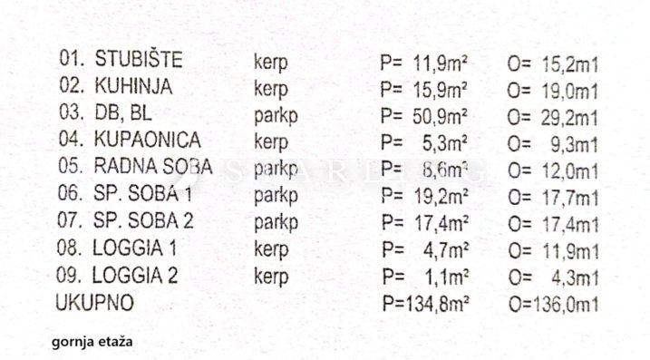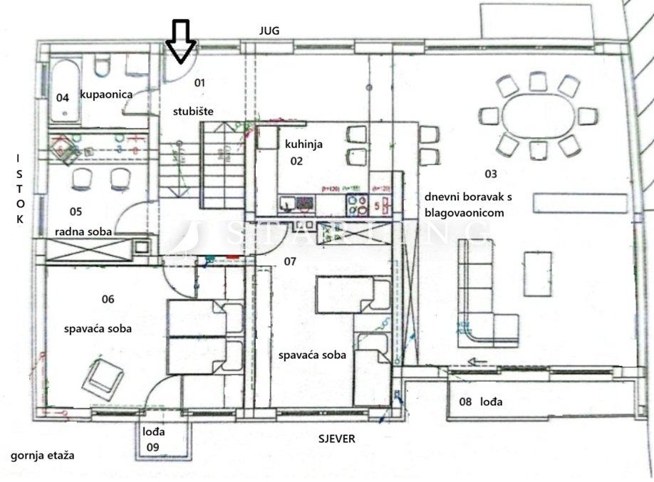 Stan se sastoji od dnevnog boravka s kuhinjom i blagovaonicom, tri spavaće sobe, dvije kupaonice, hodnika i dvije lođe.