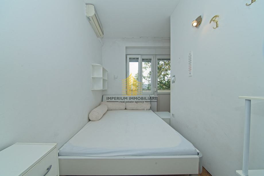 Namješten je i potpuno opremljen – uključuje kuhinju s aparatima, perilicu rublja, krevet i TV. Grijanje je centralno, a dodatnu udobnost pruža klima uređaj.