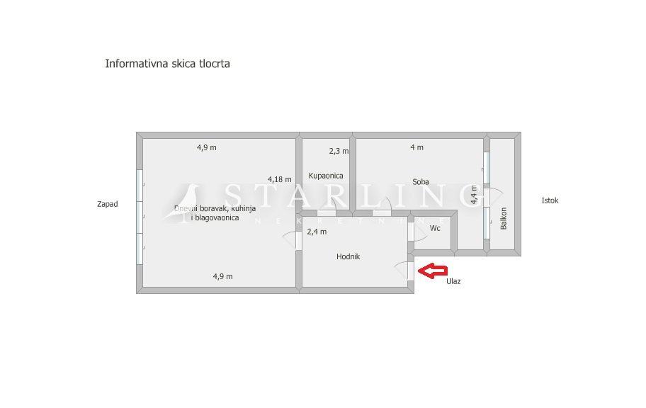 Stan se sastoji od dnevnog boravka s kuhinjom i blagovaonicom, spavaće sobe, kupaonice, odvojenog wc-a, hodnika i balkona.