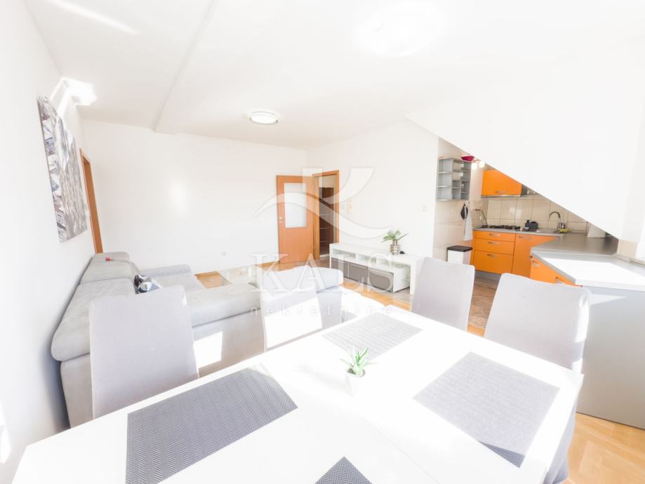 Stan se sastoji od dnevnog boravka s blagovaonicom, kuhinje, dvije spavaće sobe, kupaonice i balkona.