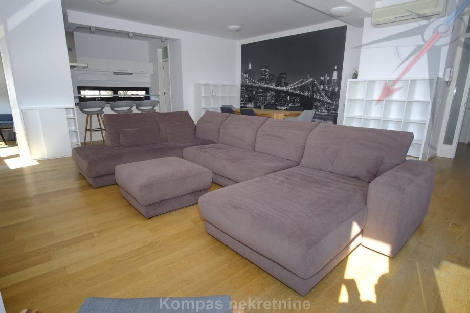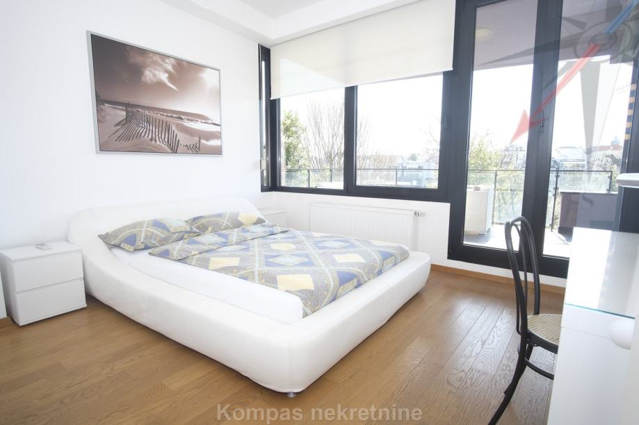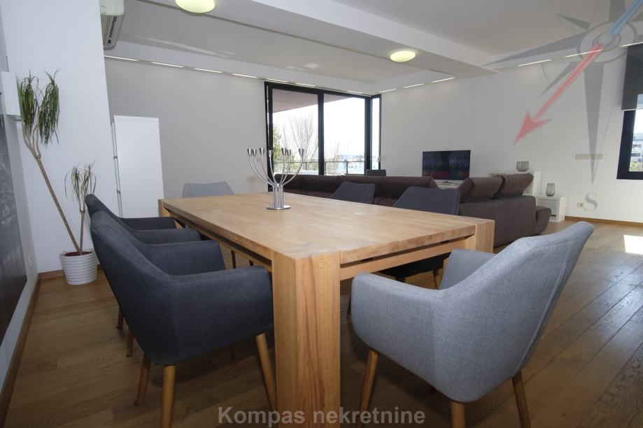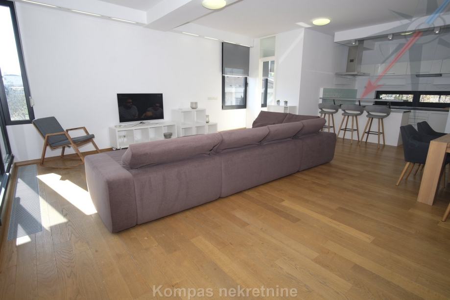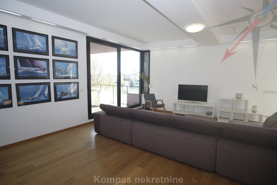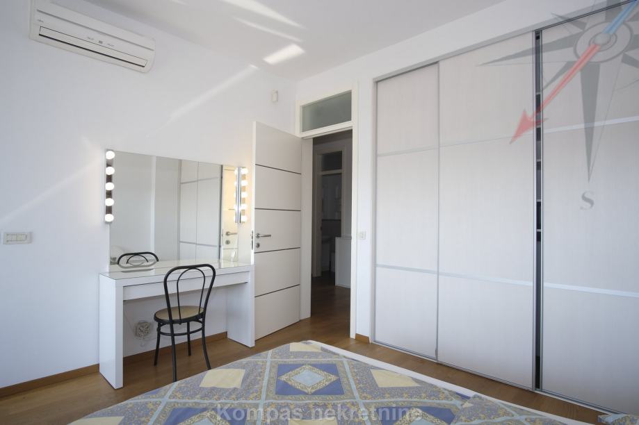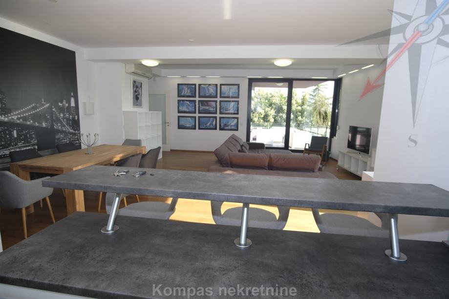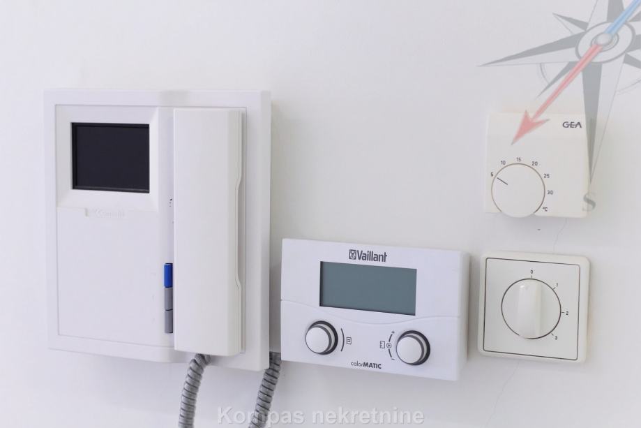 Oprema: protuprovalna vrata sa biometrijskom bravom, alarm, video portafon, prvoklasni hrastov parket, alu bravarija sa alu roletama na struju, zavjese na struju, ugradbeni ormari, podno grijanje u dnevnom boravku i kupaonicama, inverter klima uređaji u svakoj sobi, mogućnost optičkog interneta, plinsko etažno grijanje fan coil sistemom zračnih zavjesa. Režije su okvirno 300 eura mjesečno, a uključuju i troškove održavanja vrta i zajedničkih prostora, o kojima brine domar.