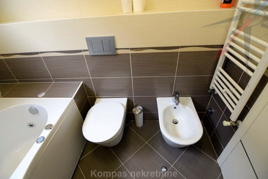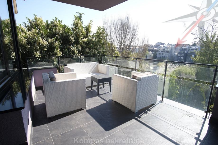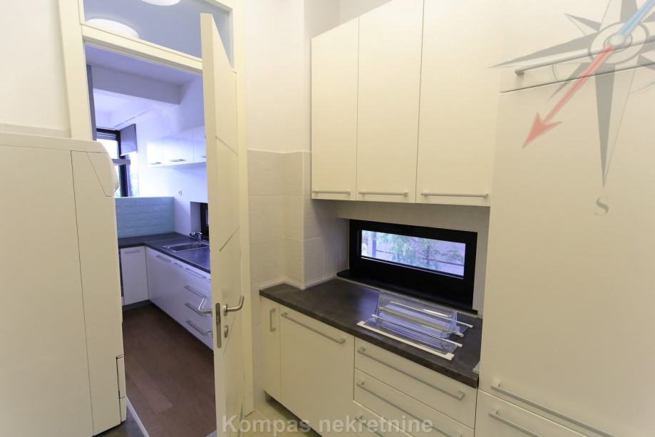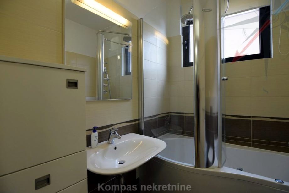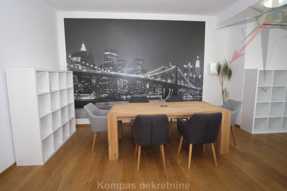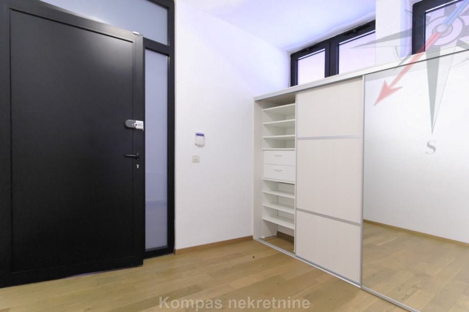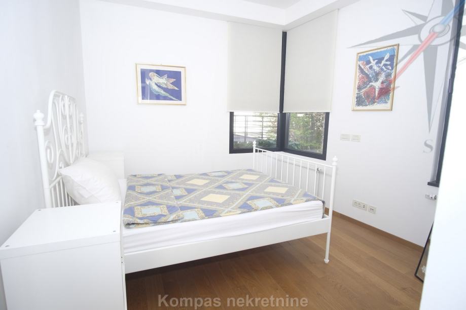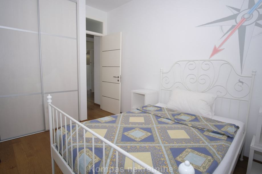 Oprema: protuprovalna vrata sa biometrijskom bravom, alarm, video portafon, prvoklasni hrastov parket, alu bravarija sa alu roletama na struju, zavjese na struju, ugradbeni ormari, podno grijanje u dnevnom boravku i kupaonicama, inverter klima uređaji u svakoj sobi, mogućnost optičkog interneta, plinsko etažno grijanje fan coil sistemom zračnih zavjesa. Režije su okvirno 300 eura mjesečno, a uključuju i troškove održavanja vrta i zajedničkih prostora, o kojima brine domar.