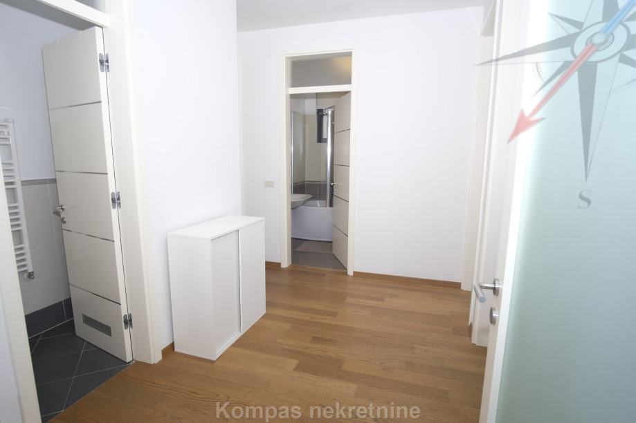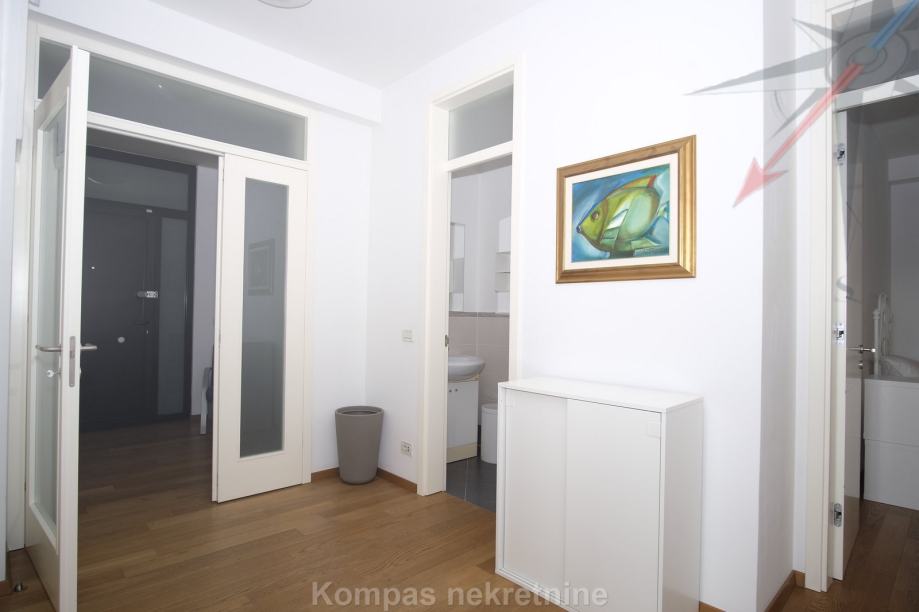 Sastoji se od prostranog ulaznog hodnika, kuhinje s ostavom, velikog dnevnog boravka, radne sobe, dvije spavaće sobe, kupaonice, toaleta, loggie ( 12 m2 ).