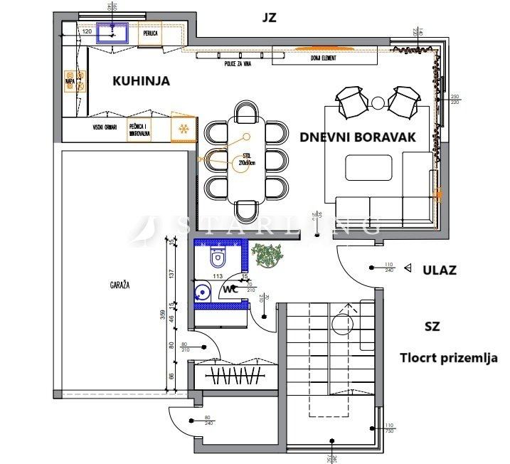 PRIZEMLJE - open space dnevni boravak s blagovaonicom i kuhinjom, gostinjski wc, tehnička soba, ulazni prostor, terasa te garaža.