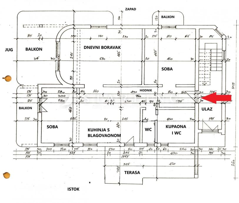 Stan se sastoji od dnevnog boravka, kuhinje i blagovaonice, dvije spavaće sobe, kupaonice s WC-om, WC-a, hodnika, 2 balkona i terase.