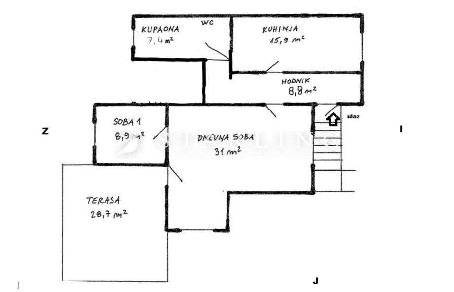 Stan se sastoji od dnevnog boravka, kuhinje i blagovaonice, spavaće sobe, kupaonice s WC-om, hodnika, terase i vrta.