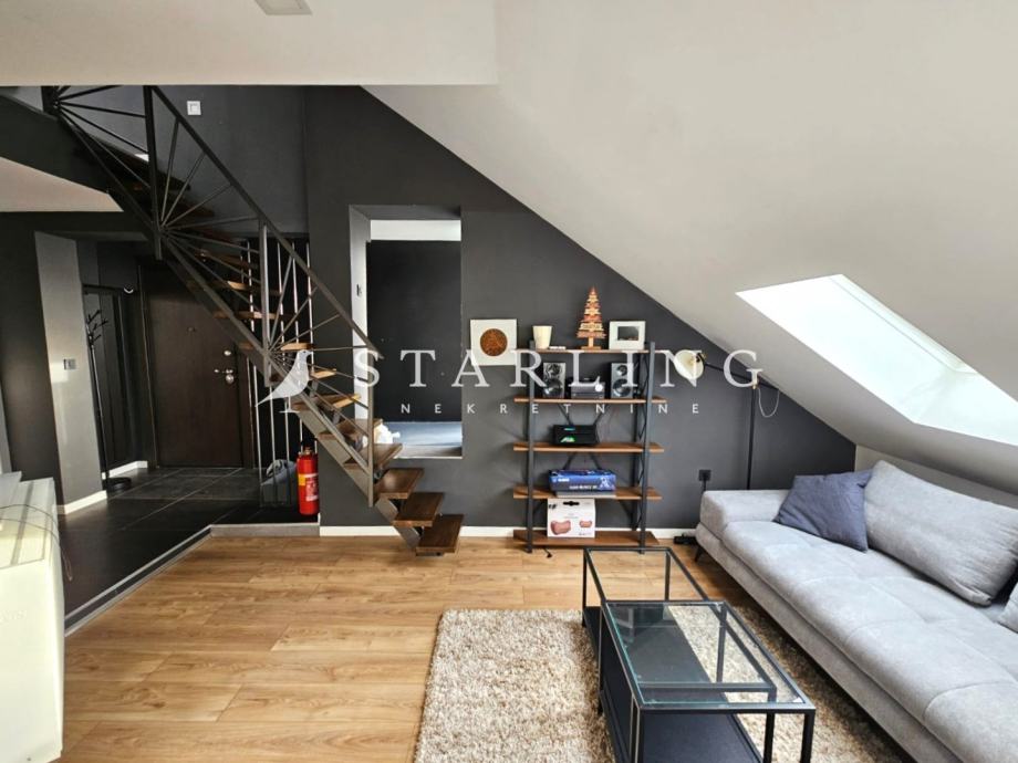 Iznajmljuje se dvosoban dvoetažan stan stambene površine 74 m2 na trećem katu stambene zgrade bez lifta.