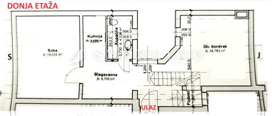 Na donjoj etaži stan se sastoji od dnevnog boravka, kuhinje s blagovaonicom, spavaće sobe, kupaonice s WC-om i nenatkrivene terase.
