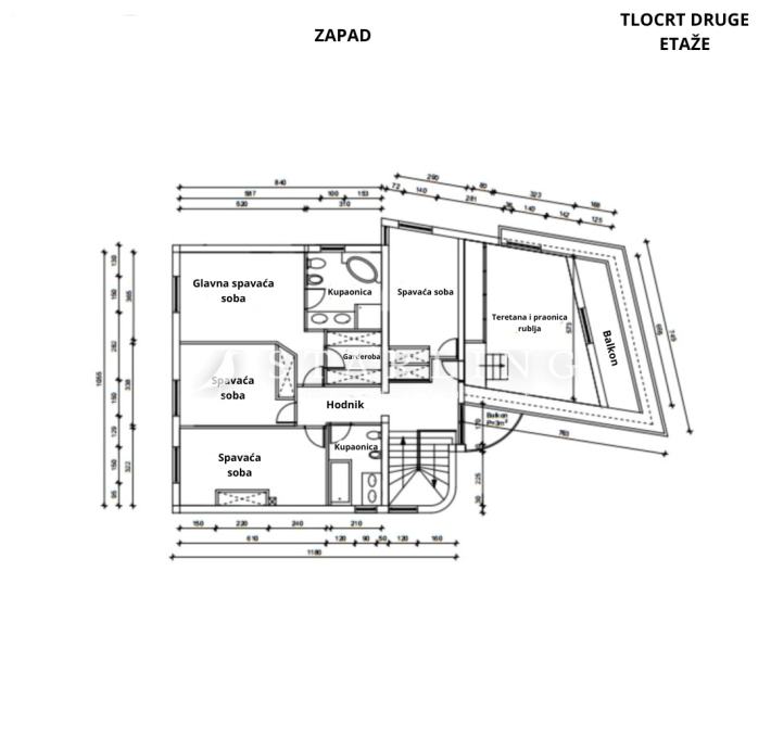 2. etaža sastoji se od glavne spavaće sobe s walk-in ormarom i kupaonicom s jaccuzijem i tuš kabinom, tri spavaće sobe, prostorije za teretanu i praonicu rublja, kupaonice, hodnika i balkona.