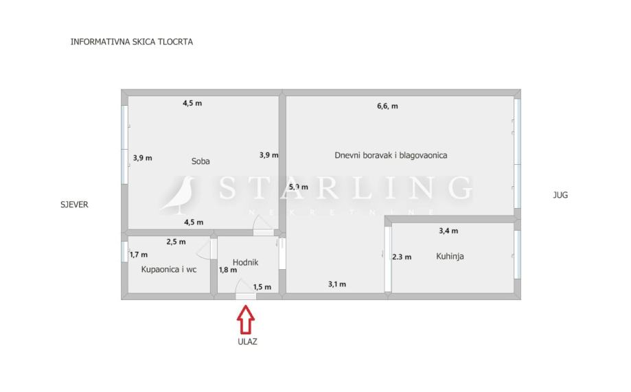 Stan se sastoji od dnevnog boravka s kuhinjom i blagovaonicom, spavaće sobe, kupaonice s wc-om i hodnika.