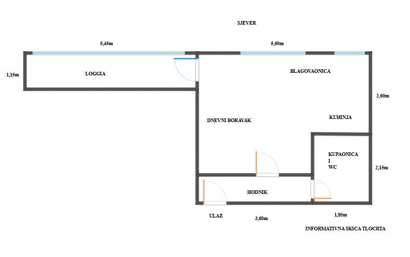 Stan se sastoji od dnevnog boravka, kuhinje i blagovaonice, hodnika, kupaonice i wc-a te loggie.