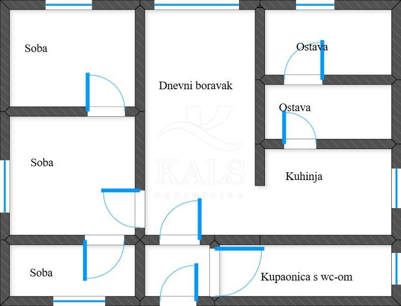 Stan se sastoji od hodnika,dnevnog boravka s kuhinjom i blagavaonicom,tri sobe,kupaone s wc-om,dvije ostave.