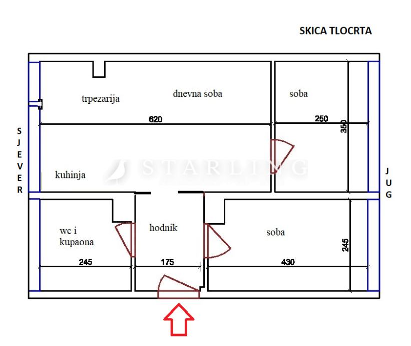 Stan se sastoji od dnevnog boravka s kuhinjom i blagovaonicom, dvije spavaće sobe, kupaonice s WC-om i hodnika.