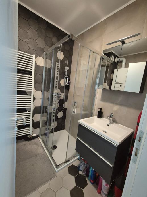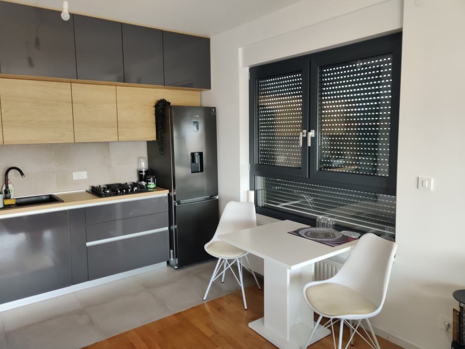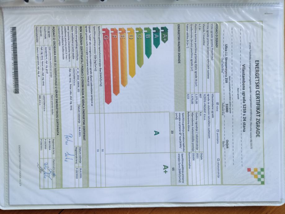Zgrada -novogradnja useljena krajem 2021. god. energetski certifikat A+ izrazito male režije, ima lift, etažno plinsko grijanje, klima uređaj, kvalitetna PVC stolarija s roletama na struju i komarnicima. U boravku s blagovaonicom i sobama je hrastov parket, kvalitetna keramika.