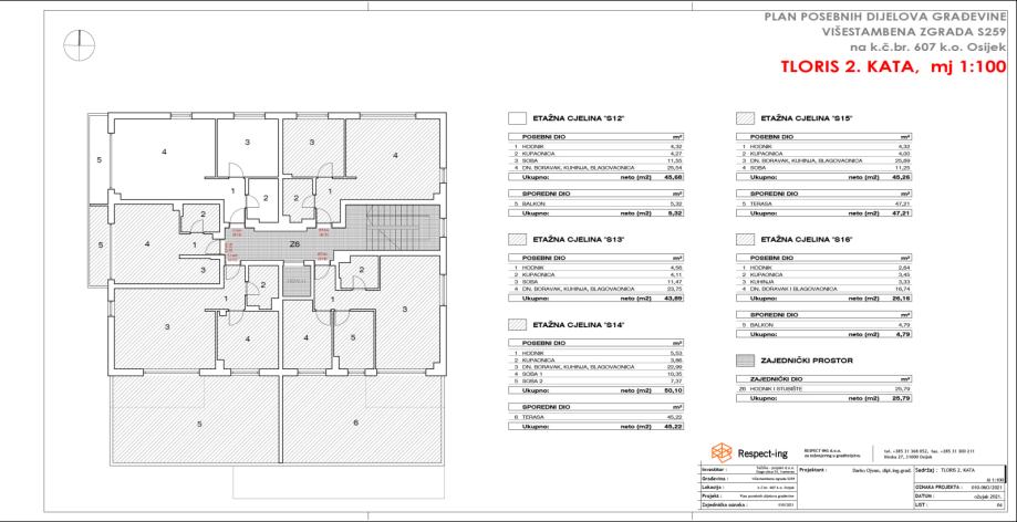 Sastoji se od hodnika, kupaonice, sobe 1, sobe 2 te dnevnog boravka, kuhinje i blagovaonice (open space koncept), terasa površine 45,22 m2, sveukupne korisne površine 95,32 m2 i vanjskog parkirnog mjesta PM15 površine 11,39m2.