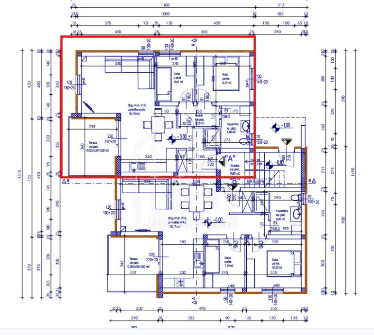 Stambena jednica A se nalazi u prizemlju, a sastoji se od ulaznog prostora i predsoblja, dvije spavaće sobe, kupaonice, kuhinja i blagovaonica te dnevni boravak. Iz dnevnog boravka se izlazi na natkrivenu terasu i vrt od 30 m2.