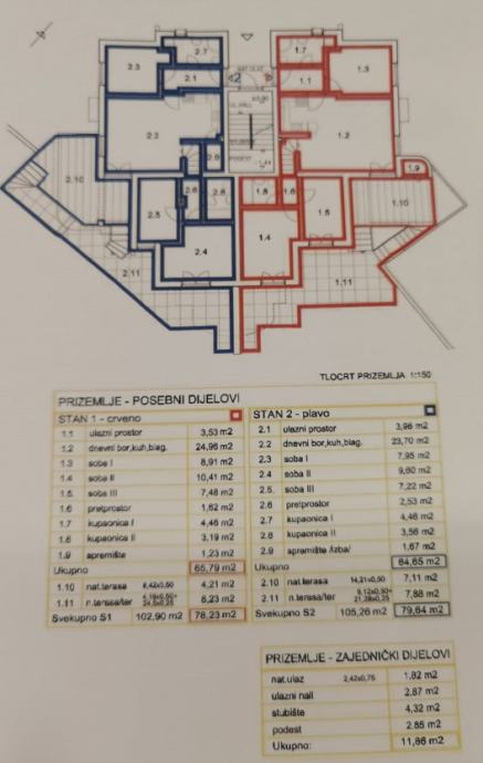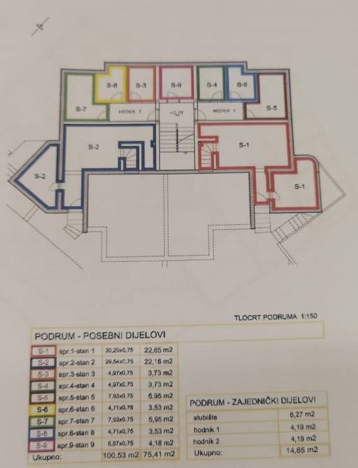 Prizemlje se sastoji od ulaznog prostora, kuhinje+dnevnog boravka+blagovaonice, jedne spavaće sobe i kupaonice. Unutarnjim stepenicama je omogućen pristup u suteren zgrade gdje se nalaze dvije spavaće sobe i kupaonica.