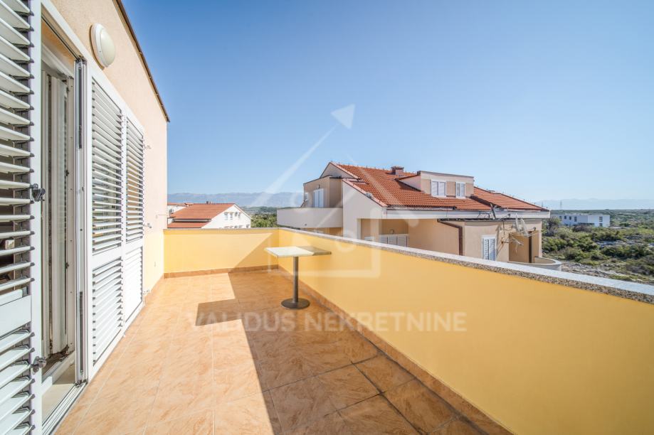 S obje terase pruža se prekrasan pogled na more i na Velebit, a svaki stan ima svoj parking. Ukupna površina oba parkinga je 25 m2.