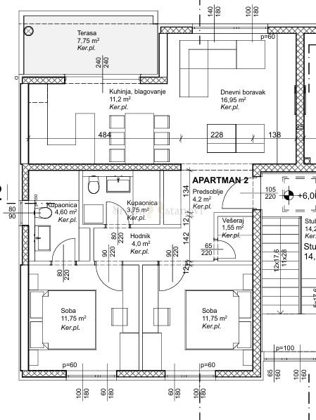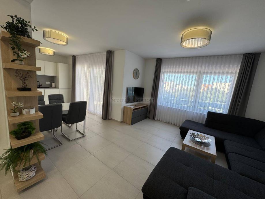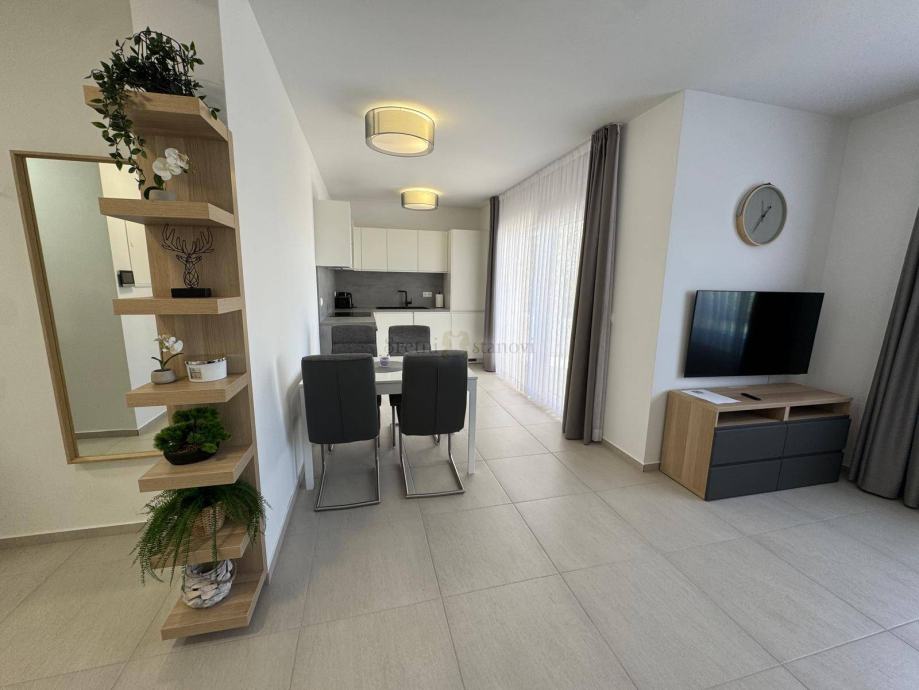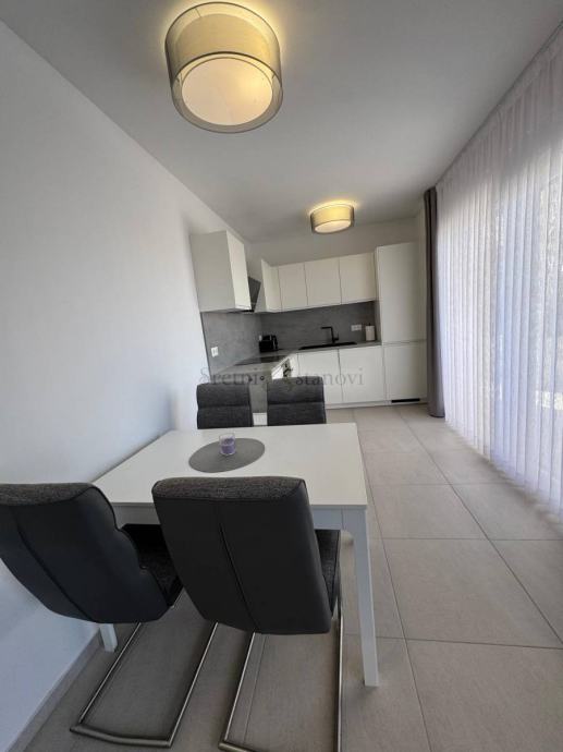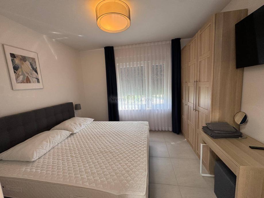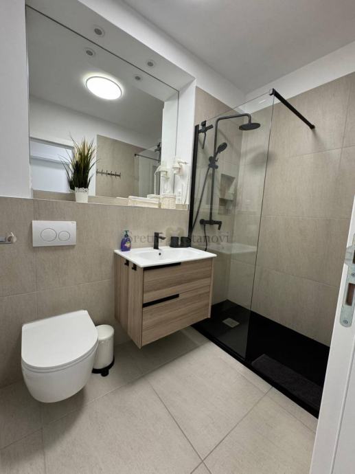 Sastoji se od dvije prostrane spavaće sobe, udobnog dnevnog boravka, kuhinje s blagovaonicom, moderno opremljenim kupaonicama te terase s koje se pruža otvoren pogled na more. Stanu pripadaju i 2 vlastita parkirna mjesta kao i veliko spremište u suterenu . Stan je potpuno opremljen prvoklasnim kuhinjskim aparatima te visoko kvalitetnim namještajem. U stanu nisu potrebna nikakva dodatna ulaganja.