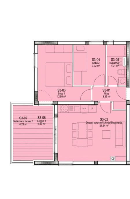 Stan se nalazi na prvom katu i funkcionalno je raspoređen te se sastoji od ulaznog prostora, dvije spavaće sobe s bračnim krevetima, kupaonice te otvorenog prostora kuhinje, blagovaonice i dnevnog boravka s izlazom na terasu.