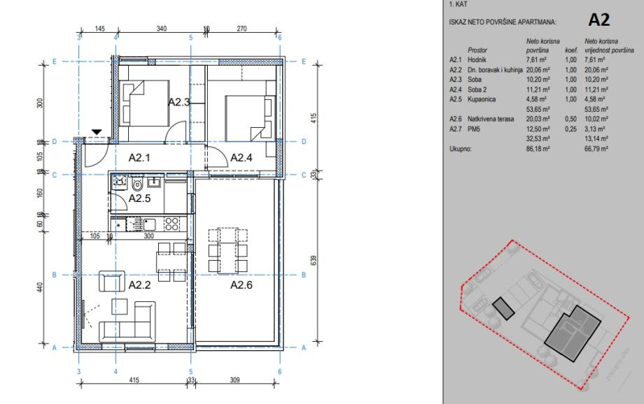 Prodaje se trosobni apartman (A2) obračunske površine cca 66,79 m2 na I katu novogradnje u Novalji.
