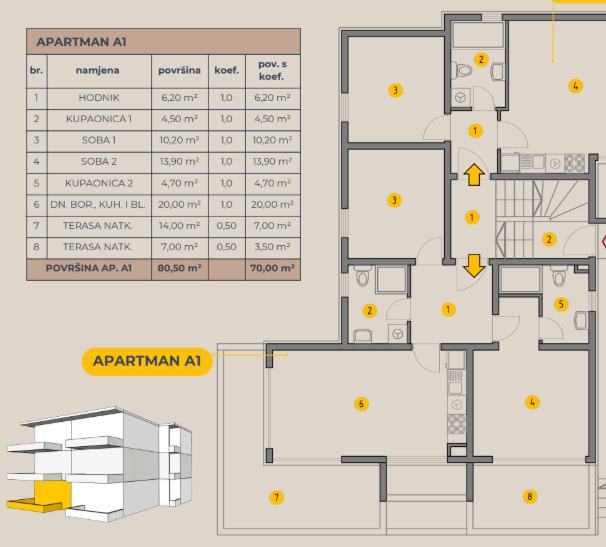Stan se nalazi u prizemlju te se sastoji od hodnika, dvije kupaonice, dvije spavaće sobe, kuhinje s blagavaonicom i dnevnim boravkom te dvije natkrivene terase. Sveukupno netto korisne površine 80,50 m2