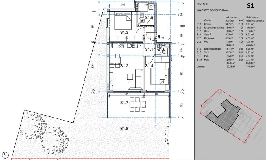 Sastoji se od hodnika, kupaonice s wc-om, 2 sobe, dnevnog boravka i kuhinje te velike, natkrivene terase (22,48 m2) i velikog dvorišta površine 80,17 m2.