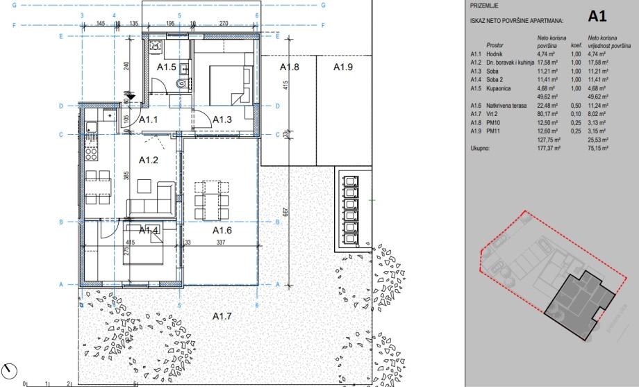 Sastoji se od hodnika, kupaonice s wc-om, 2 sobe, dnevnog boravka i kuhinje te velike, natkrivene terase (22,48 m2) i velikog dvorišta površine 80,17 m2.