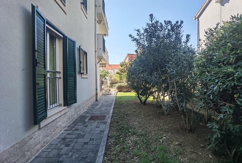 Sastoji se od 2 spavaće sobe, kupaone s wc-om, dnevnog boravka s kuhinjom i blagovaonom i velike terase površine 28,80 m2 s tendom sa senzorima i brodskom inox ogrado, okružene zelenilom iz koje se izlazi u prekrasni vrt.