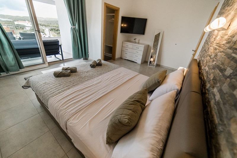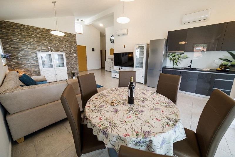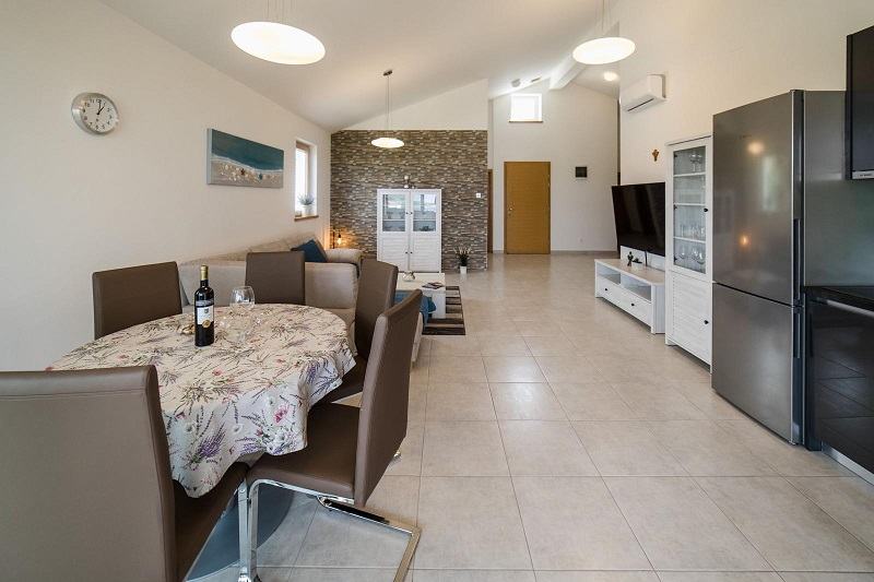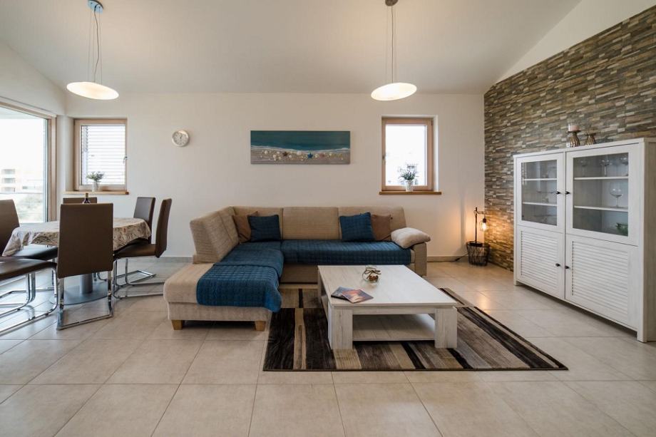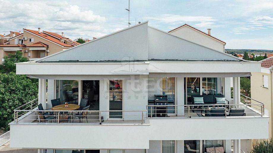 Sastoji se od predsoblja, dnevnog boravka s kuhinjom, 4 sobe, 3 kupaonice s wc-om i velike terase s prekrasnim pogledom na more.