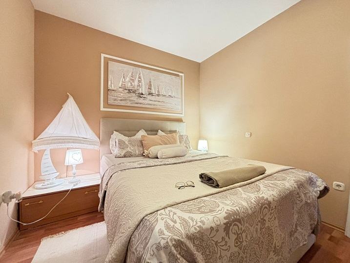 Sastoji se od hodnika, dnevnog boravka s kuhinjom, 2 spavaće sobe, kupaonice s wc-om i terase s pogledom na more.