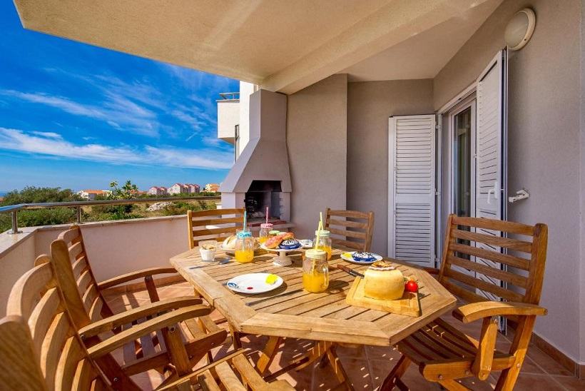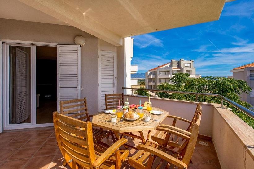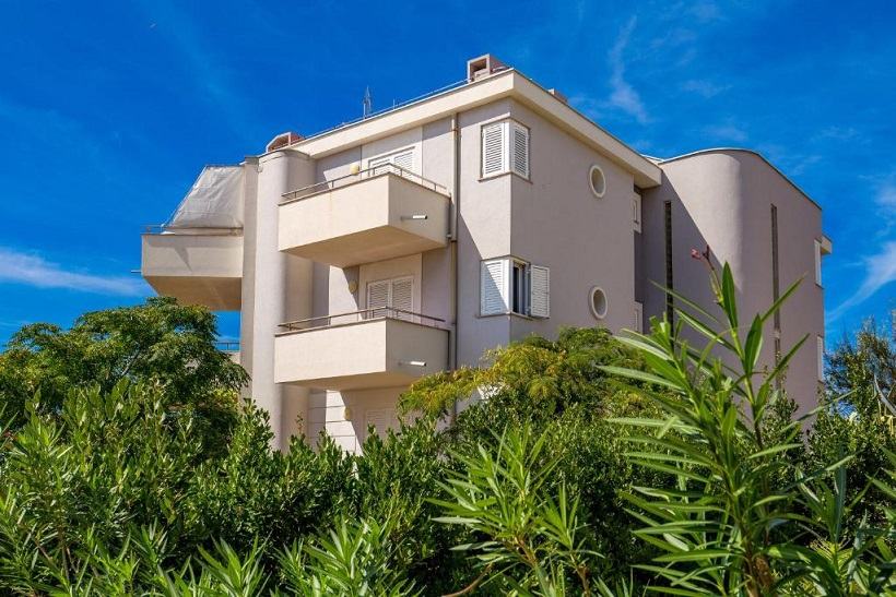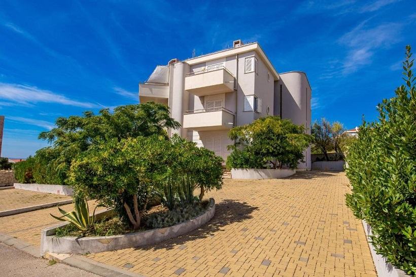 Prodaje se trosobni apartman (E-6) na prvom katu zgrade okružene zelenilom s pogledom na cijelu Novalju.