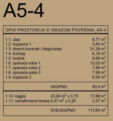 Stan A5-4 se nalazi se u zgradi A. Sastoji se od ulaza (8,77 m2), dnevnog boravka i blagavaonice (31,38 m2), kuhinje (6,18 m2), hodnika (8,69 m2), dvije kupaone (3,80 m2, 6,58 m2), tri spavaće sobe (12,05 m2, 7,96 m2, 7,99 m2), loggie (23,84 m2 - po obračunskom koeficijentu 17,88 m2) i nenatkrivene terase (9,47 m2 - po obračunskom koeficijentu 2,37 m2)