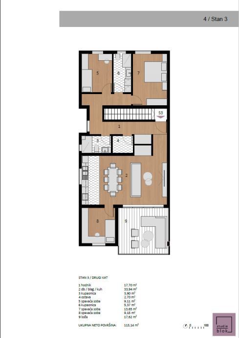 Stan se sastoji od hodnika, kuhinje, blagovaonice i dnevnog boravka otvorenog koncepta s izlazom na prostranu terasu, tri spavaće sobe, ostave i dvije kupaonice.