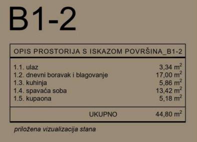 Stan B1-2 se nalazi se u zgradi B. Sastoji se od ulaza (3,34 m2), dnevnog boravka i blagavaonice (17,00 m2), kuhinje (5,86 m2), kupaone (5,18 m2) i spavaće sobe (13,42 m2).