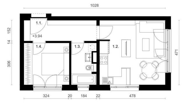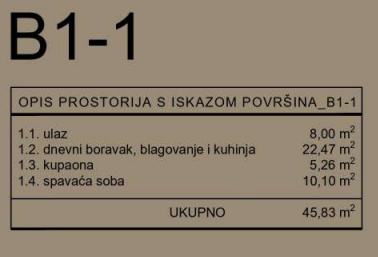 Stan B1-1 se nalazi se u zgradi B. Sastoji se od ulaza (8,00 m2), dnevnog boravka, blagavaonice i kuhinje (22,47 m2), kupaone (5,26 m2) i spavaće sobe (10,10 m2).