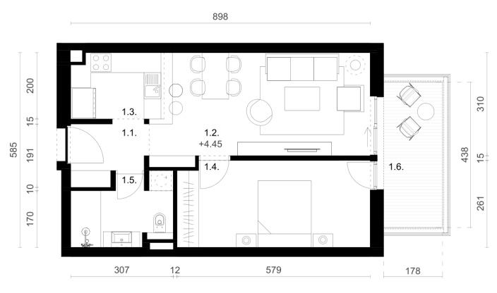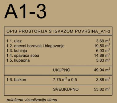 Stan A1-3 se nalazi se u zgradi A. Sastoji se od ulaza (3,69 m2), dnevnog boravka i blagavaonice (19,50 m2), kuhinje (6,03 m2), kupaone (5,83 m2), spavaće sobe (14,89 m2) i balkona (7,75 m2 - po obračunskom koeficijentu 3,88 m2).