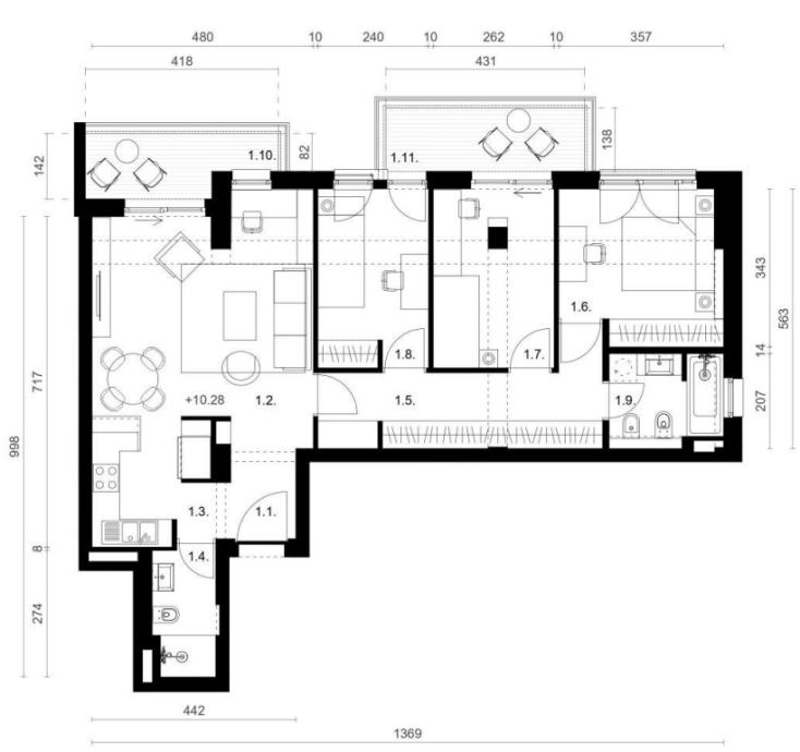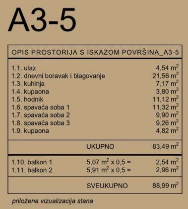 Stan A3-5 se nalazi se u zgradi A. Sastoji se od ulaza (4,54 m2), dnevnog boravka i blagavaonice (21,56 m2), kuhinje (7,17 m2), hodnika (11,12 m2), dvije kupaone (3,80 m2, 4,82 m2), tri spavaće sobe (11,32 m2, 9,90 m2, 9,26 m2) i dva balkona (5,07 m2 - po obračunskom koeficijentu 2,54 m2, 5,91 m2 - po obračunskom koeficijentu 2,96 m2).