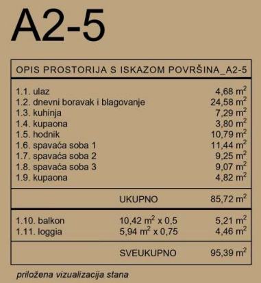 Stan A2-5 se nalazi se u zgradi A. Sastoji se od ulaza (4,68 m2), dnevnog boravka i blagavaonice (24,58 m2), kuhinje (7,29 m2), hodnika (10,79 m2), dvije kupaone (3,80 m2, 4,82 m2), tri spavaće sobe (11,44 m2, 9,25 m2, 9,07 m2), loggie (5,94 m2 - po obračunskom koeficijentu 4,46 m2) i balkona (10,42 m2 - po obračunskom koeficijentu 5,21 m2)