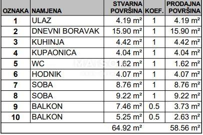 Stvarna površina s otvorenim i zatvorenim prostorima iznosi 64,92 m², dok je prodajna površina 58,56 m².