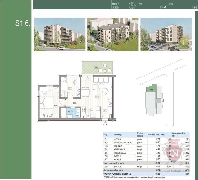 U slikama je istaknuta zgrada koja je u fazi gradnje, dok tlocrt prikazuje stan koji je predmet prodaje ovog oglasa. Prilikom odabira stana obvezna je kupnja parkirnog ili garažnog mjesta.