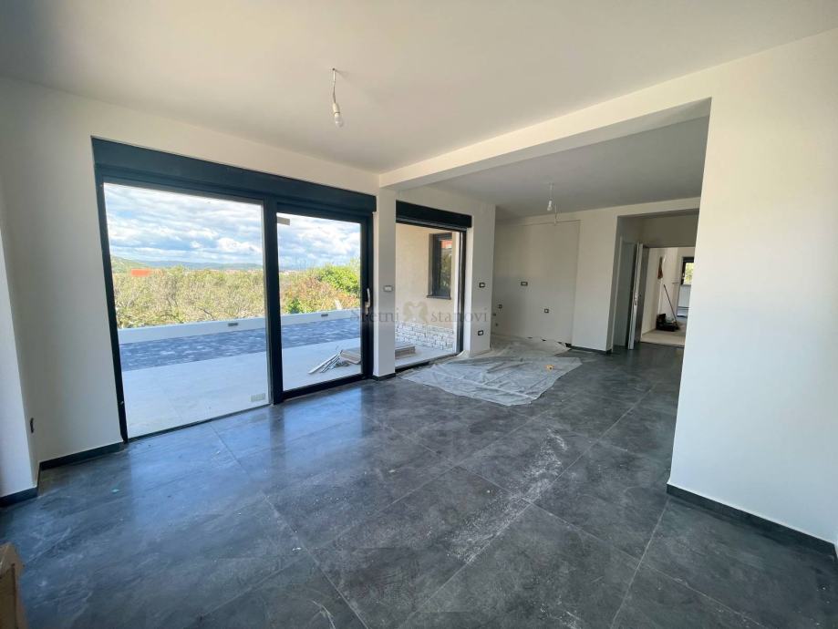Stan se sastoji od ulaznog hodnika, 2 spavaće sobe, kupaone te dnevnog boravka s kuhinjom i blagovaonom iz kojeg se kroz veliku kliznu stijenu izlazi na predivnu natkrivenu terasu s vrtom i pogledom na more.