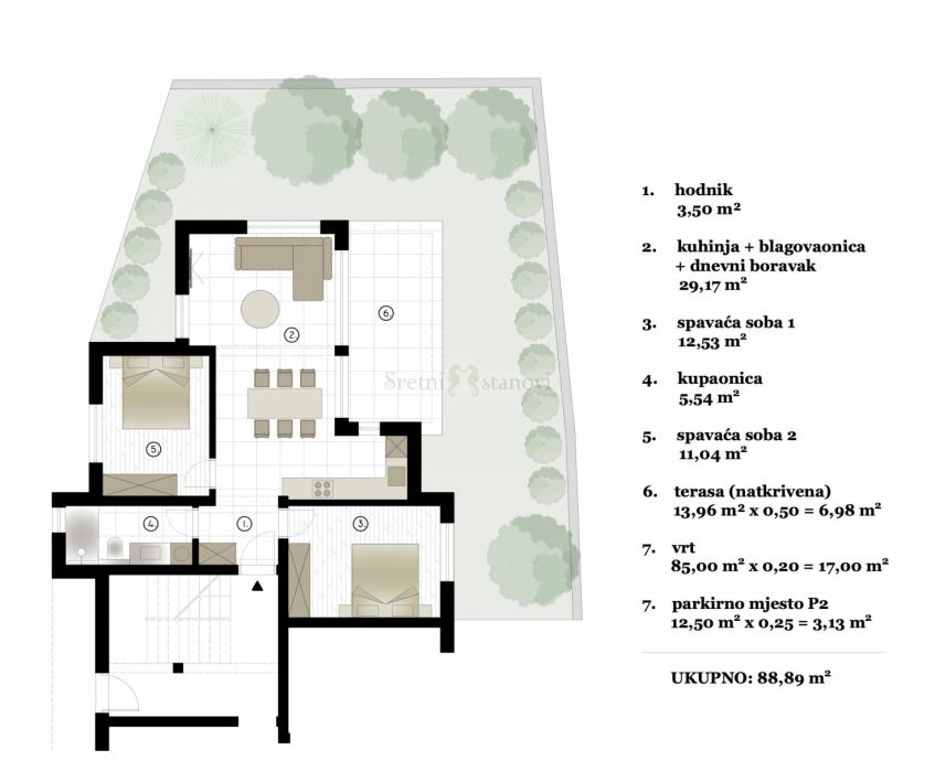 Sstanu pripada jedno označeno vanjsko parkirno mjesto u okućnici zgrade.