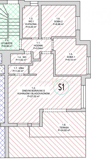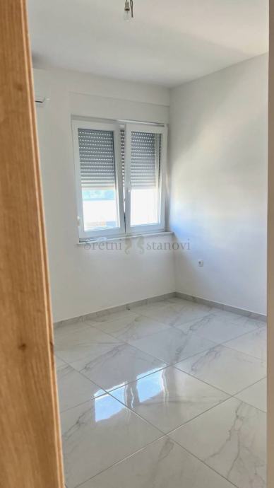 Stan se sastoji od ulaznog hodnika, dnevnog boravka s kuhinjom i blagovaonom, kupaonice, dodatnog WC-a, dvije spavaće sobe, izbe i lijepe natkrivene terase sveukupne korisne povišine 80,82 m2, te od pripadnog velikog vrta površine 90 m2.