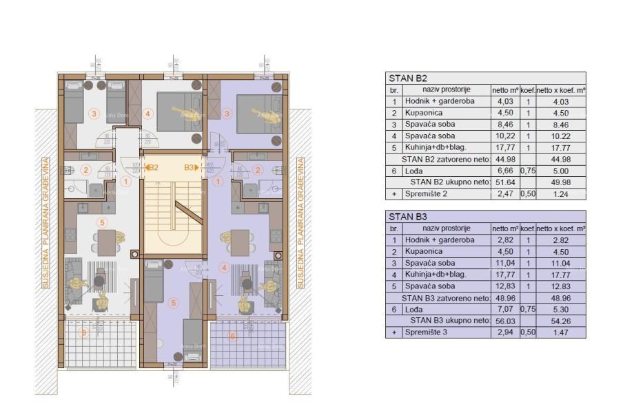 Stan na 1. katu, oznake B3 koji se sastoji od hodnika, kupaonice,dvije spavaće sobe, kuhinje s blagavaonicom te terasom.
