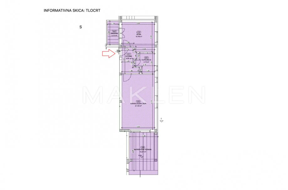 Stan se sastoji od open space dnevnog boravka s kuhinjom i blagovaonicom, spavaće sobe, kupaonice, hodnika, spremišta i terase.