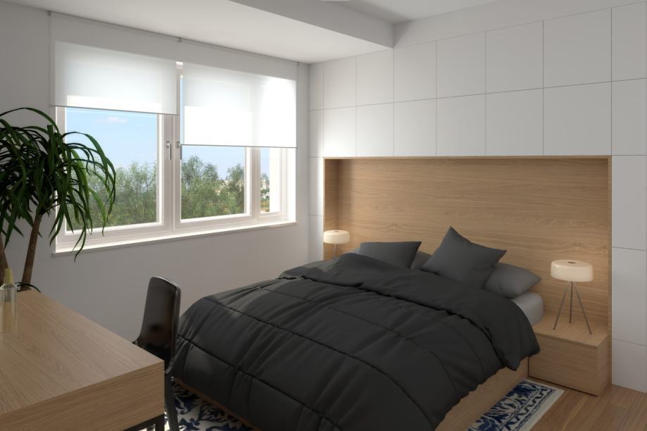 - Unutarnja stolarija: lakirana je u mat bijeloj boji sa skrivenim pantima, magnetnom bravom te zvučno izoliranim krilom koji je ispunjen ivericom. Ulazna vrata u stan su protuprovalna/ protupožarna te zvučno izolirana s master key sistemom marke Dierre van standardne dimenzije (izvedba visokog standard).