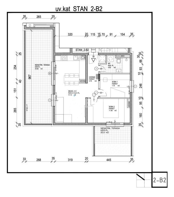 Stan 2-B2 sastoji se od dnevnog boravka s blagovaonicom i kuhinjom, 2 spavaće sobe, kupaonice, hodnika i 2 terase.