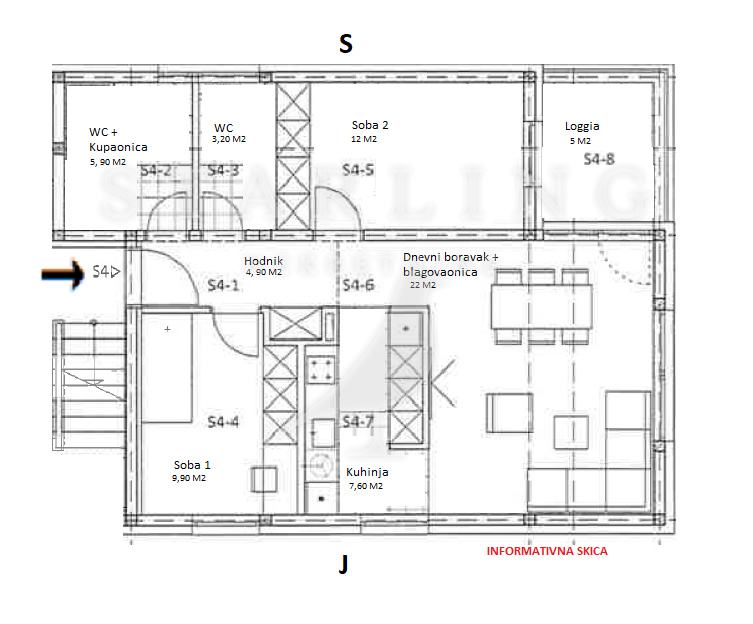 Stan se sastoji od dnevnog boravka i blagovaonica, kuhinje, dvije sobe, wc-a s kupaonicom, wc-a, hodnika, loggie i vanjskog parkirnog mjesta.